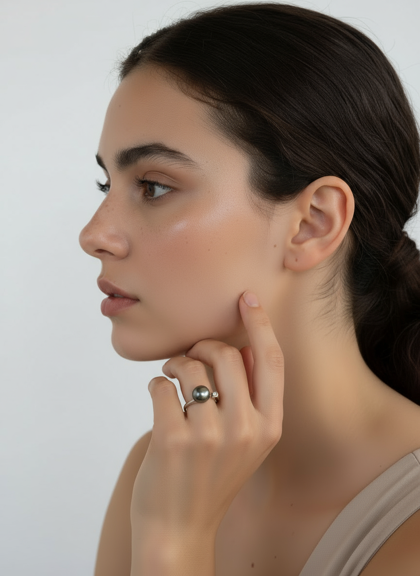 Exude timeless elegance with this exquisite Tahitian South Sea pearl ring. Featuring a luminous 10mm silver-hued, round AAAAA-quality pearl, its radiant surface glows with natural depth and iridescence, making it a true statement of luxury.