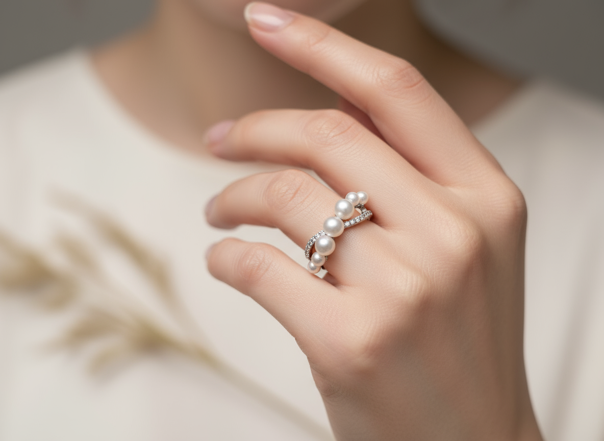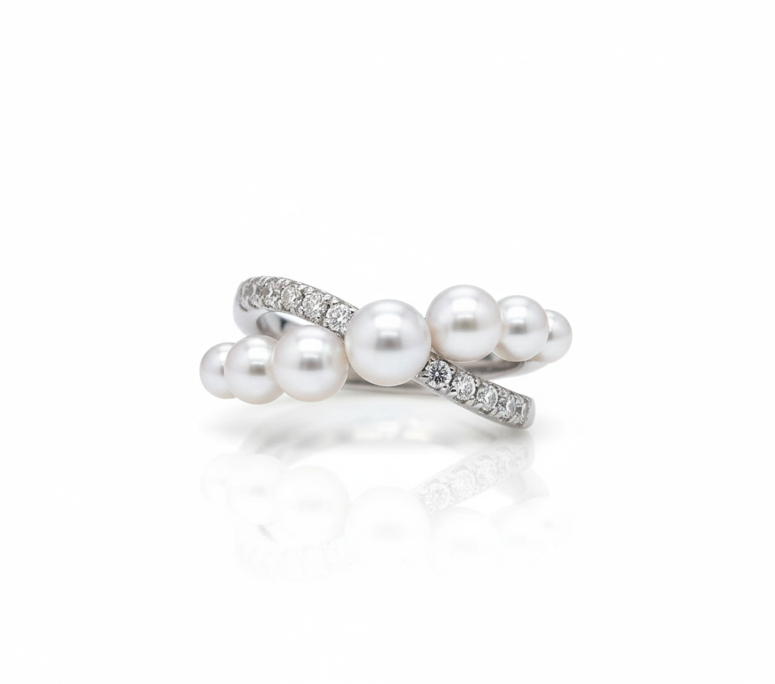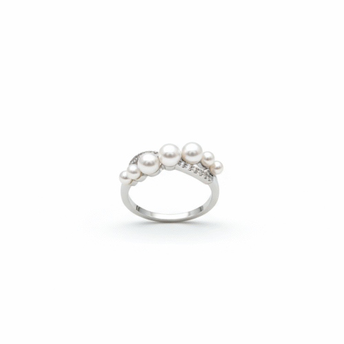 Embrace modern sophistication with our exquisite “Celestial Cascade” Ring, a design that beautifully merges contemporary flair with timeless elegance. This captivating piece features a delicate cascade of lustrous freshwater pearls, varying in size to create an organic and dynamic flow across the finger. Each pearl gleams with a radiant white shine, perfectly smooth and reflecting light with a soft, luminous glow. The pearls are artfully intertwined with a sparkling band, meticulously pavé-set with brilliant diamonds that add a touch of dazzling brilliance and luxurious shimmer. The polished silver-tone metal enhances the pearls’ purity and the diamonds’ sparkle, making this ring a true statement of refined taste.