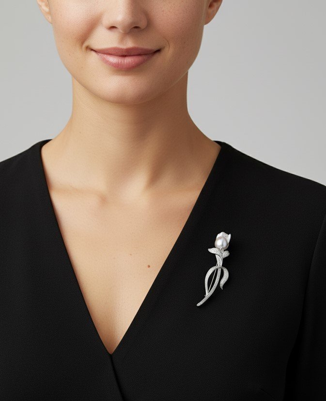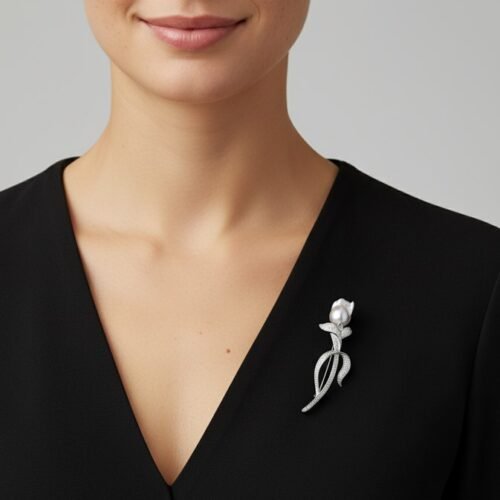 The combination of shimmering crystals, sculpted rose design, and the individuality of the baroque pearl creates a brooch that embodies elegance, artistry, and sophistication. Whether worn on an evening dress, coat, or scarf, this brooch is a versatile statement piece perfect for weddings, gala evenings, or meaningful gift-giving.