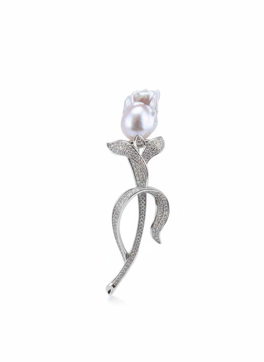 Add a touch of timeless romance with this elegant freshwater baroque pearl rose brooch. Designed in a graceful rosebud silhouette, the brooch is adorned with pavé-set crystals that sparkle delicately against its silver finish. At the top blooms a lustrous baroque freshwater pearl, celebrated for its unique organic shape and natural glow, making every piece truly one-of-a-kind.