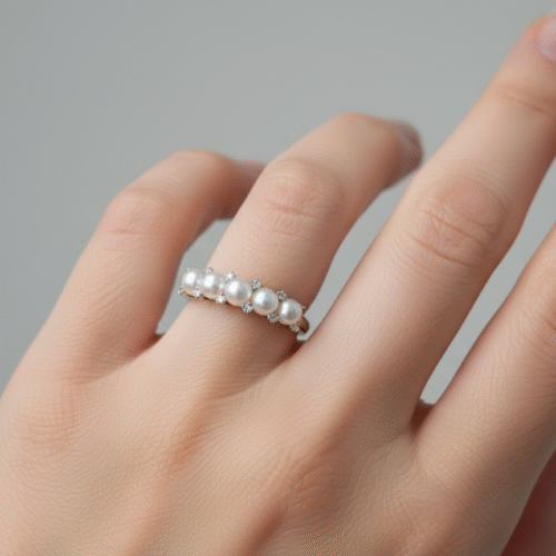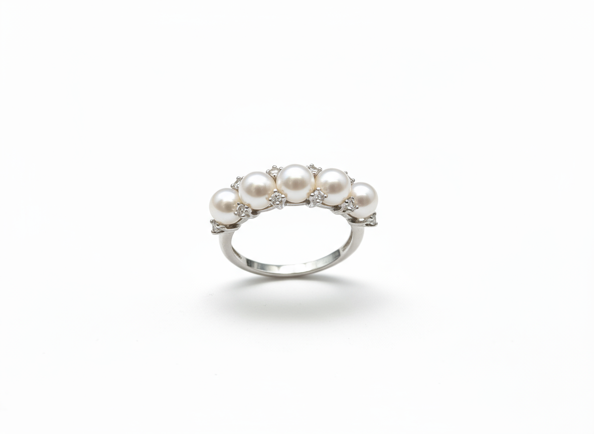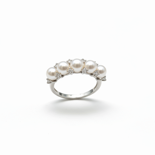 Discover understated elegance with our captivating “Pearls of Harmony” Ring, a gracefully designed band showcasing five exquisite 5mm freshwater pearls. Each pearl boasts a naturally smooth surface, a clear, sharp focus, and a luminous glow, radiating with a radiant white shine. These pristine pearls are artfully nestled within a shimmering sterling silver band, accented by delicate, sparkling diamonds that enhance their natural brilliance. The harmonious arrangement of pearls creates a timeless yet modern aesthetic, perfect for celebrating enduring beauty and sophisticated style.