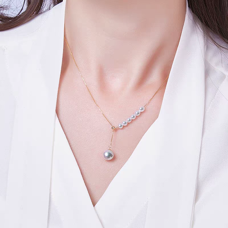 The design features a beautifully arranged series of six perfectly round Akoya pearls that descend along one side of a delicate 18K gold chain. The chain passes through a polished gold bead, allowing a single, slightly larger pearl to drop with captivating effect. The asymmetrical balance between the pearl cascade and the solo pendant creates a visually intriguing piece, designed to elongate the neckline and add a sophisticated, eye-catching flourish to any look.