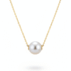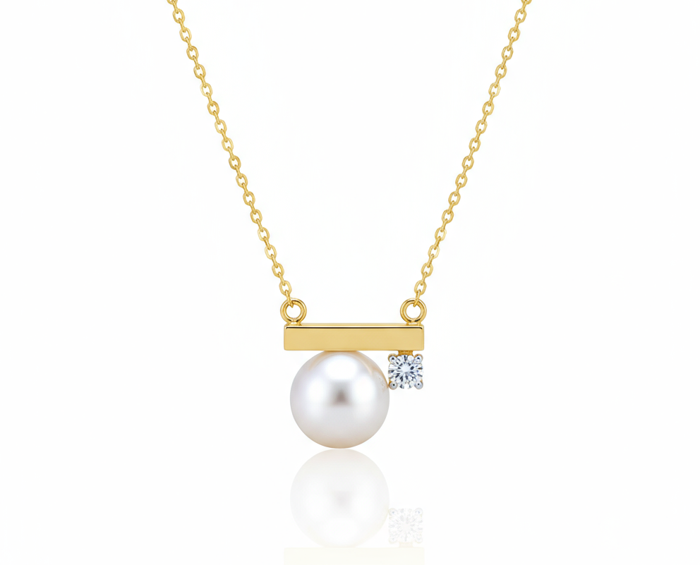 This beautiful necklace reimagines classic elegance with a contemporary twist. At its center, a lustrous, perfectly round freshwater pearl is suspended beneath a sleek, polished gold bar. The design is elevated by a sparkling zircons set to one side, adding a flash of brilliant light.