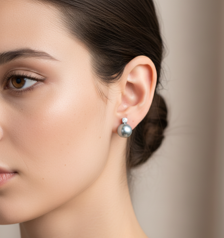 Embrace a truly distinct and modern elegance with these extraordinary Blue Grey Akoya pearl stud earrings. Directly harvested from the pure sea waters of Japan, each earring features a genuine, perfectly round Akoya pearl that showcases a rare, naturally colored blue-grey tone. This unique hue is highly sought after, known for its deep, smoky body and an incredible, high-mirror luster that sets it apart from traditional white pearls.
